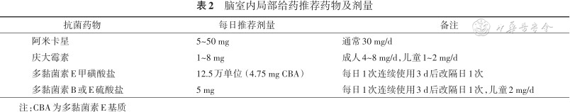 CRE所致中枢神经系统感染的治疗包括全身静脉给药和脑室内给药,可根据体外药敏结果选择敏感和易透过血脑屏障的药物,如美罗培南(MIC≤ 8 mg/L)、磷霉素等药物,同时需根据药物血脑屏障通透能力增加剂量。有研究认为联合治疗疗效可能优于单药治疗。新的酶抑制剂复方制剂头孢他啶/阿维巴坦、美罗培南/法硼巴坦治疗中枢神经系统感染的临床研究非常有限。但从兔子脑膜炎的实验模型显示阿维巴坦在兔子脑脊液的曲线下面积(AUC)为血清AUC的38%[40, 41]。目前亦有使用头孢他啶/阿维巴坦治疗肺炎克雷伯杆菌中枢神经系统感染的成功病例。因此头孢他啶/阿维巴坦治疗CRE导致的中枢神经系统感染值得期待。脑室内给药包括多CMS、多黏菌素B硫酸盐,氨基糖苷类稀释后进行脑室内注射(表2)[42, 43],但需注意脑室内局部给药导致的化学性炎症。中枢神经系统感染疗程常需要3~4周甚至更长的时间。在积极抗感染的同时需尽早拔除脑室内或者腰大池置管。