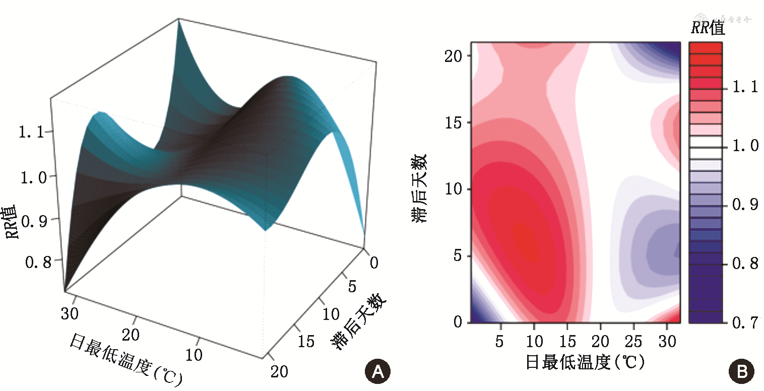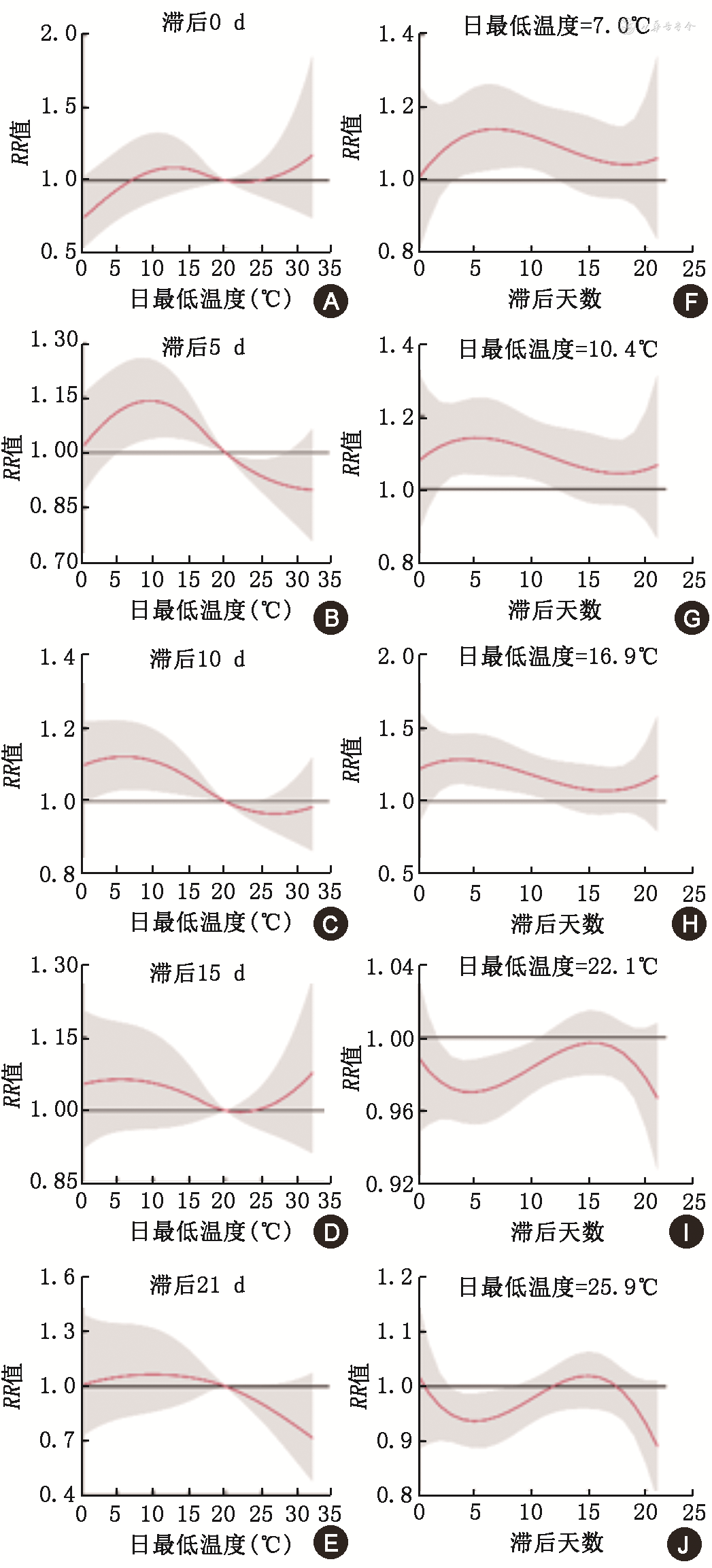 累积滞后5、10、15和21 d时,与参考温度(20 ℃)相比,最低温度为10.4 ℃的RR值(95%CI)分别为1.93(1.08~3.46)、3.49(1.64~7.45)、5.00(2.01~12.46)和6.69(2.18~20.48);最低温度为22.1 ℃的RR值(95%CI)分别为0.87(0.77~0.98)、0.77(0.66~0.90)、0.74(0.62~0.89)和0.68(0.55~0.85)。