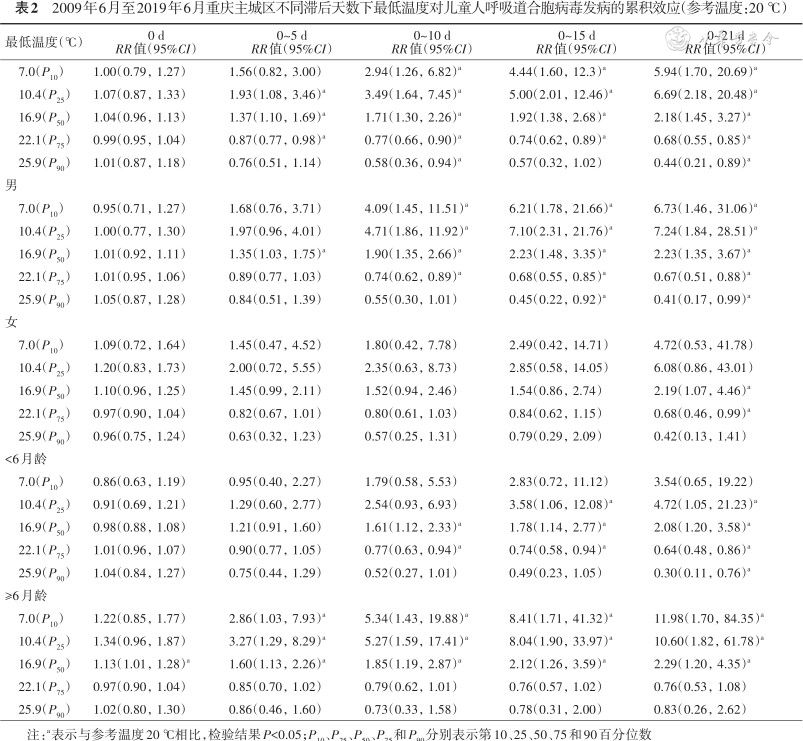 3 107例患儿的HRSV阳性率为34.53%(1 073例),年龄M(Q1,Q3)为6(3,13)月龄,男性占64.31%(690例)。HRSV日发病数与最低温度(r=-0.220,P<0.001)、最高温度(r=-0.221,P<0.001)、平均温度(r=-0.221,P<0.001)、降水量(r=-0.052,P<0.001)存在负相关,与日照时间(r=0.011,P<0.001)、平均相对湿度(r=0.095,P<0.001)存在正相关。与参考温度(20 ℃)相比,最低气温6~10 ℃在滞后4~8 d时对HRSV发病的RR值为1.11~1.14,最低温度5~19 ℃在滞后5 d和2~19 ℃在滞后10 d时RR值分别为1.02~1.14和1.00~1.03。累积滞后5、10、15和21 d时,与参考温度(20 ℃)相比,最低温度为10.4 ℃的RR值(95%CI)分别为1.93(1.08~3.46)、3.49(1.64~7.45)、5.00(2.01~12.46)和6.69(2.18~20.48);最低温度为22.1 ℃的RR值(95%CI)分别为0.87(0.77~0.98)、0.77(0.66~0.90)、0.74(0.62~0.89)和0.68(0.55~0.85)。在累积效应中,与参考温度(20 ℃)相比,在不同滞后天数下最低温度对男童和女童的最大RR值(95%CI)分别为7.24(1.84~28.51)和2.19(1.07~4.46),对<6月龄儿童和≥6月龄儿童的最大RR值(95%CI)分别为4.72(1.05~21.23)和11.98(1.70~84.35)。