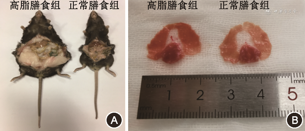 1.不同膳食小鼠基本情况比较:基线时,NFD和HFD小鼠体重分别为(19.17±0.59)和(19.12±0.64)g,差异无统计学意义(P=0.857)。饲养16周后,未发现小鼠死亡,HFD组小鼠较NFD组小鼠体重均值增加52.10%,腹围和附睾脂肪湿重分别增加26.22%和351.92%(表2)。HFD组小鼠腹部膨隆(图1A),膈肌增厚(图1B),膈肌湿重较NFD组增加71.43%,但两组小鼠膈肌相对重量差异无统计学意义(P>0.05)。见表2。