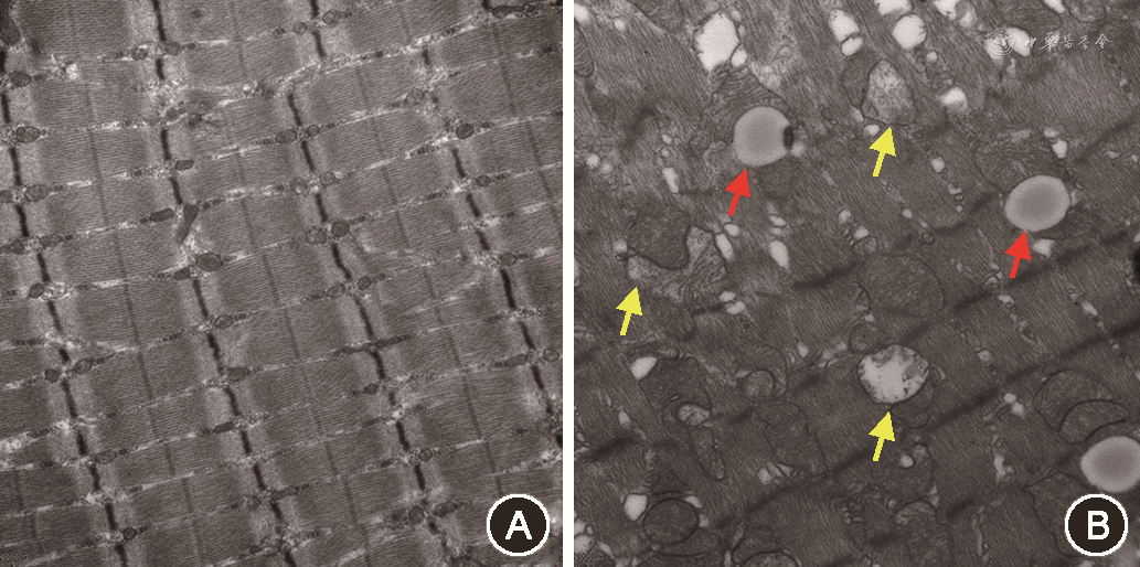 5.不同膳食小鼠膈肌线粒体超微结构比较:饲养16周后,电镜下NFD组小鼠膈肌线粒体成行排列,呈小卵圆形,结构清晰,线粒体膜完整,线粒体嵴排列规整;肌原纤维排列整齐,肌节完整(图4A)。HFD组小鼠膈肌线粒体肿胀,大小不一,线粒体嵴断裂,部分消失甚至形成空泡(图4B黄色箭头所示);肌膜下及肌内见大量脂滴,常靠近线粒体,肌原纤维受压排列紊乱,甚至出现断裂(图4B橙色箭头所示)。