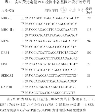6.MHC和线粒体动力学相关基因表达水平检测:采用Trizol试剂提取膈肌组织总RNA后进行实时荧光定量PCR检测,反应条件为:95 ℃预变性10 min,95 ℃变性15 s,60 ℃退火15 s,72 ℃延伸15 s,共45个循环,以甘油醛-3-磷酸脱氢酶(GAPDH)mRNA为内参,以2-△△Ct法计算目标基因的表达量,引物序列见表1。