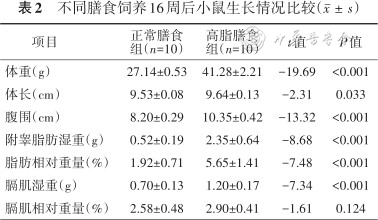| 项目 | 正常膳食组 (n=10) | 高脂膳食组 (n=10) | t值 | P值 |