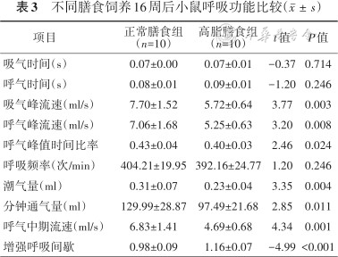 不同膳食饲养16周后小鼠呼吸功能比较()