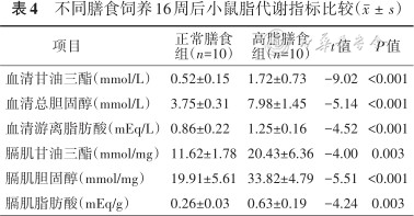 | 项目 | 正常膳食组(n=10) | 高脂膳食组(n=10) | t值 | P值 |