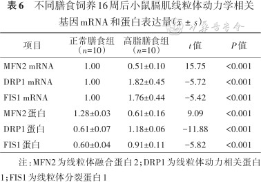 6.不同膳食小鼠膈肌线粒体动力学比较:饲养16周后,HFD组小鼠膈肌MFN2 mRNA及蛋白的表达量低于NFD组(P<0.001),DRP1和FIS1基因及蛋白的表达量高于NFD组(均P<0.001)(表6)。HFD组肌浆网Ca2+-ATP酶2(SERCA2)基因的表达量为0.65±0.13,低于NFD组(1.00)(P<0.001)。