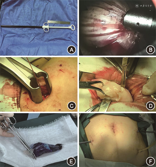 2.手术方法:全身麻醉下患者取仰卧位或膀胱截石位,常规消毒铺巾,按以下步骤进行:(1)取脐孔上缘做长1 cm纵形切口,常规建立人工气腹并置镜观察腹盆腔,于右下腹麦氏点置入5 mm穿刺套管(trocar),耻骨联合上3~5 cm及左侧下腹置入5或10 mm trocar;(2)探查腹盆腔收集冲洗液进行细胞学检查,使用普通腹腔镜器械常规行子宫肌瘤剔除术,剔除肌瘤后,缝合子宫切口。收集器(图1A)经脐部1 cm trocar送入腹腔,轻推手柄,收集器在腹腔内张开,使用穿刺针经侧腹壁trocar向收集器内注入亚甲蓝溶液(1∶25,2 ml溶于50 ml生理盐水)10 ml,将子宫肌瘤装入收集器内,外拉收紧手柄,收集器袋口收紧后收入外鞘和trocar中(图1B),将收集器和trocar一同拔出体外;(3)扩大脐部切口至2~3 cm,切口撑开器充分扩张切口(图1C),脐部切口周围以纱垫保护,向上外提拉收集器;(4)展开袋口,暴露肌瘤,布巾钳向外牵拉标本,直视下以普通手术刀圆锥形或螺旋形“削苹果”式将肌瘤切割成小块取出(图1D),直至剩余标本全部取出体外,收集器随即取出。肌瘤组织送术中快速病理检查和术后常规病理检查。更换脐部切口周围纱布及取肌瘤过程中的手术器械,再次置入腹腔镜,组织钳钳夹脐部切口并按压纱布防止漏气,检查腹盆腔及穿刺孔有无肌瘤组织碎片及亚甲蓝外漏着色组织;(5)用3 000 ml生理盐水冲洗腹盆腔,再次收集200 ml冲洗液进行细胞学检查分析;(6)再次向收集器内注入亚甲蓝,外裹手术纱布后检查纱布有无亚甲蓝染色(图1E);(7)检查无出血后,排净气体,移除腹腔镜器械,并用2-0可吸收线逐层缝合腹膜、前鞘筋膜、皮下组织加固脐孔,然后4-0可吸收线缝合脐部皮肤,重塑脐部外形(图1F)。