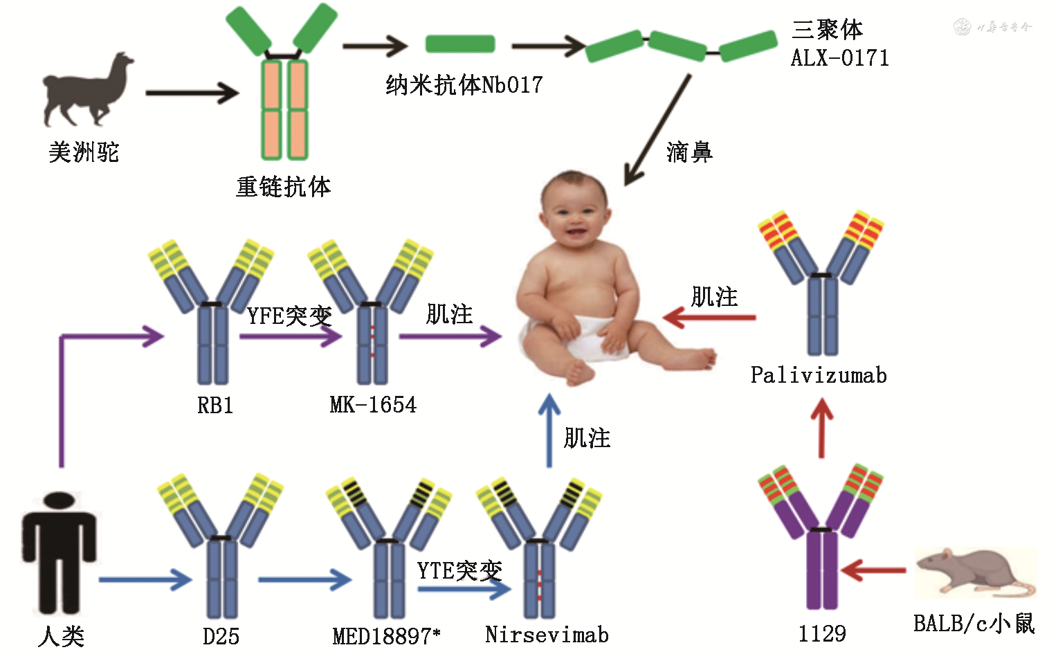 3. 全人源单克隆抗体Nirsevimab:Nirsevimab是一种全人源单克隆抗体,Nirsevimab由全人源单克隆抗体D25优化改造而来,D25识别Pre-F蛋白构象表位Ø,对A和B两个亚型都有很强的中和作用,对HRSV A2和HRSV B9320毒株的半数最大抑制浓度(half-maximal inhibitory concentration,IC50)值为10.8 μg/L和7.1 μg/L。将D25互补决定区替换5个氨基酸,骨架区替换4个氨基酸后形成MEDI8897*,如图1所示。MEDI8897*对HRSV A2和HRSV B9320毒株的IC50值为2.2 μg/L和1.8 μg/L,中和活性比D25提高4倍左右。继续对MEDI8897*抗体可结晶片段(Fc)进行优化(替换M252Y、S254T和T256E三个氨基酸)形成Nirsevimab,该抗体在婴幼儿体内半衰期大大延长(62.5~72.9 d)[31],同时具有良好的安全性[24]。阿斯利康(AstraZeneca)与法国赛诺菲(Sanofi)公司合作开展的Ⅱb期临床试验显示,在HRSV流行季开始前给早产儿(29~35周)一次肌肉注射50 mg预防用生物制品nirsevimab,150 d后可使健康早产儿发生HRSV相关下呼吸道感染就医率和住院率分别降低70.1%和78.4%[32]。据新华网最新报道[33],nirsevimab针对健康婴儿的全球多中心双盲随机Ⅲ期临床试验结果显示,nirsevimab达到主要终点,即在整个典型的呼吸道合胞病毒流行季中,与安慰剂组相比,nirsevimab组中健康早产婴儿和足月婴儿因呼吸道合胞病毒引起的下呼吸道感染呈现具有统计学意义的绝对减少。安全性结果在nirsevimab组和安慰剂组之间无显著临床差异。