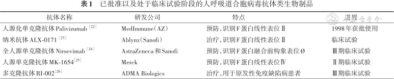 | 人源单克隆抗体MK-1654[25] | Merck | 预防,识别F蛋白线性表位Ⅳ | Ⅱ期临床试验 |
