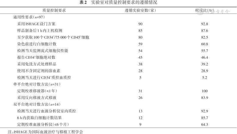 共收到97家实验室回报的调查问卷信息,99家实验室回报的质评物检测结果。问卷调查数据显示实验室对设门方案、移液方式和获取细胞数等关键质量控制要求的遵循比率较高,分别为92.8%、83.9%和82.5%;而对采用全血质控品开展室内质量控制、溶血素的选择、处理样品是否洗涤、是否报告绝对计数以及仪器的质量控制等要求的遵循比率较低,分别为5.2%、28.9%、39.2%、46.4%和55.7%。质评物检测结果显示,国内实验室CD34+相对计数的变异系数与CAP质评数据相近,但绝对计数的变异系数大于CAP质评数据。