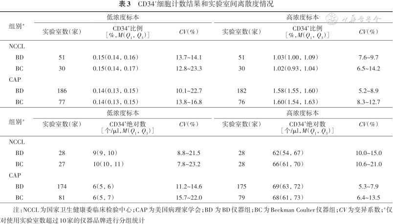 CD34+细胞计数结果和实验室间离散度情况