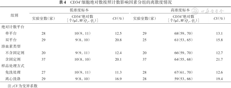 2. 按照计数影响因素分组的离散度情况:质评物绝对计数检测结果按照计数影响因素分组的统计结果如表4所示,其中遵循指南要求的单平台方法组、溶血素不含固定剂组和样品免洗处理组CV相对较小。