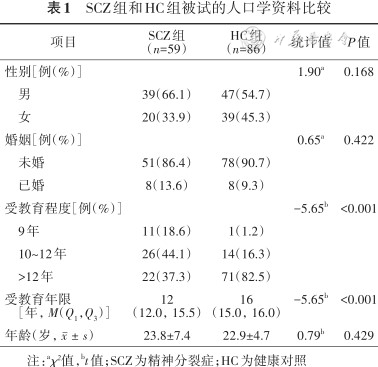 | 项目 | SCZ组 (n=59) | HC组 (n=86) | 统计值 | P值 |