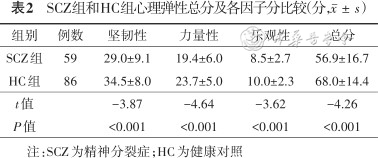 SCZ组心理弹性总分及各因子分均低于HC组,且差异有统计学意义(均P<0.05),见表2。