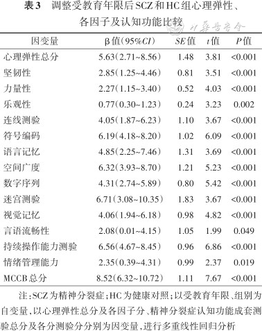注:SCZ为精神分裂症;HC为健康对照;以受教育年限、组别为自变量,以心理弹性总分及各因子分、精神分裂症认知功能成套测验总分及各分测验分分别为因变量,进行多重线性回归分析