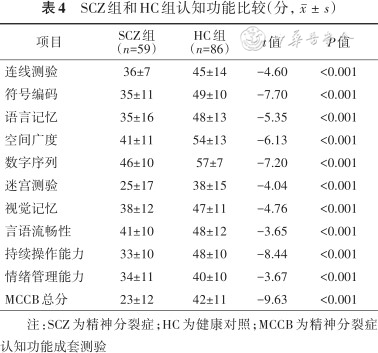 SCZ组在MCCB结果各领域得分及MCCB总分均低于HC组,且差异有统计学意义(均P<0.05,表4)。