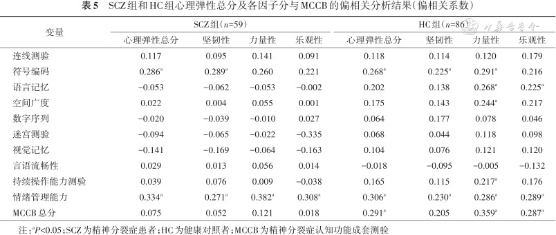 SCZ组和HC组心理弹性总分及各因子分与MCCB的偏相关分析结果(偏相关系数)