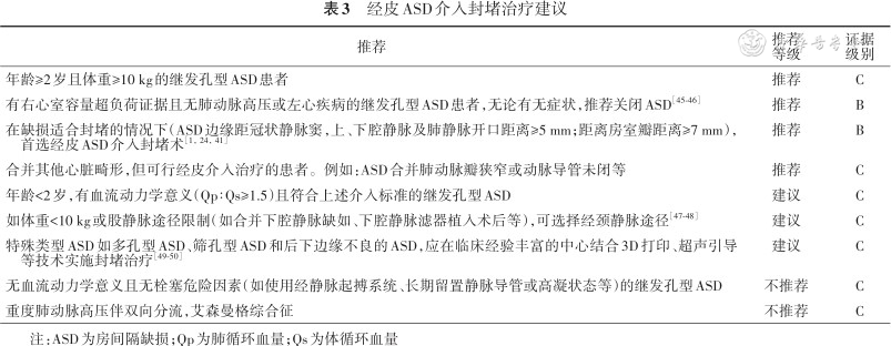 | 特殊类型ASD如多孔型ASD、筛孔型ASD和后下边缘不良的ASD,应在临床经验丰富的中心结合3D打印、超声引导等技术实施封堵治疗[49, 50] | 建议 | C |
