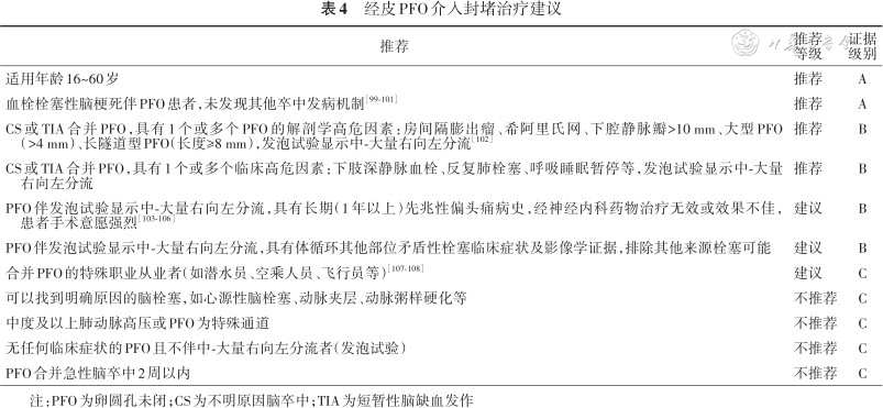 | 血栓栓塞性脑梗死伴PFO患者,未发现其他卒中发病机制[99, 100, 101] | 推荐 | A |
