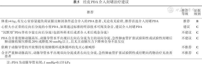 | 体重≥4 kg,有左心室容量超负荷证据且解剖条件适合介入的PDA患者,无论有无症状,推荐首选介入封堵PDA | 推荐 | B |
