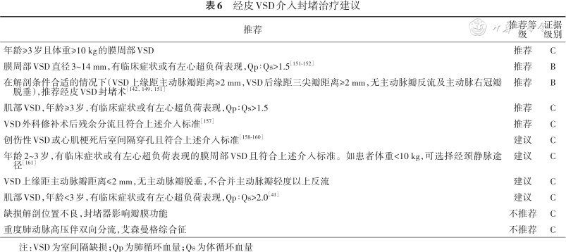 | 在解剖条件合适的情况下(VSD上缘距主动脉瓣距离≥2 mm,VSD后缘距三尖瓣距离≥2 mm,无主动脉瓣反流及主动脉右冠瓣脱垂),推荐经皮VSD封堵术[142,149,151] | 推荐 | B |