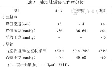 超声心动图和心导管检查是PVS诊断和评估的主要方式。通过超声心动图测量峰值流速、跨瓣压差等评估PVS的程度(表7)[176, 177]。心导管可测量肺动脉跨瓣压差、右心室收缩压等血流动力学指标,准确评估狭窄的程度;同时右心室造影可见增厚的肺动脉瓣和收缩期喷射性血流束,呈现“射流征”和“圆顶征”。