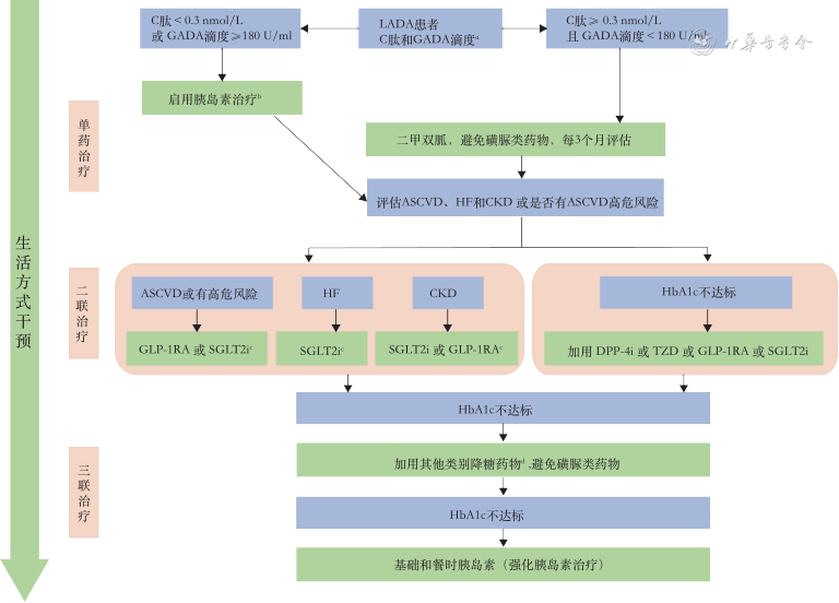 合并ASCVD推荐首选胰高血糖素样肽-1受体激动剂(GLP-1RA)或SGLT2i,合并心力衰竭推荐首选SGLT2i,合并慢性肾病推荐首选SGLT2i 或GLP-1RA。未合并ASCVD、心力衰竭或慢性肾脏病者,推荐加用DPP-4i、TZD、SGLT2i或GLP-1RA。如血糖控制不佳,可再加其他类别降糖药,但应避免磺脲类药物。并随访评估C肽水平和GADA滴度[5],及时调整治疗方案。