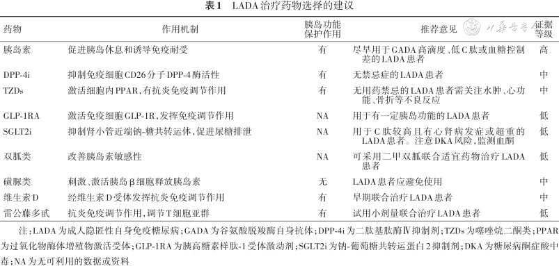 LADA治疗应根据血糖控制、C肽水平、GADA滴度及心肾并发症情况,选择可能具有免疫调控、胰岛保护和心肾结局改善的降糖药物,实现个体化血糖控制目标。