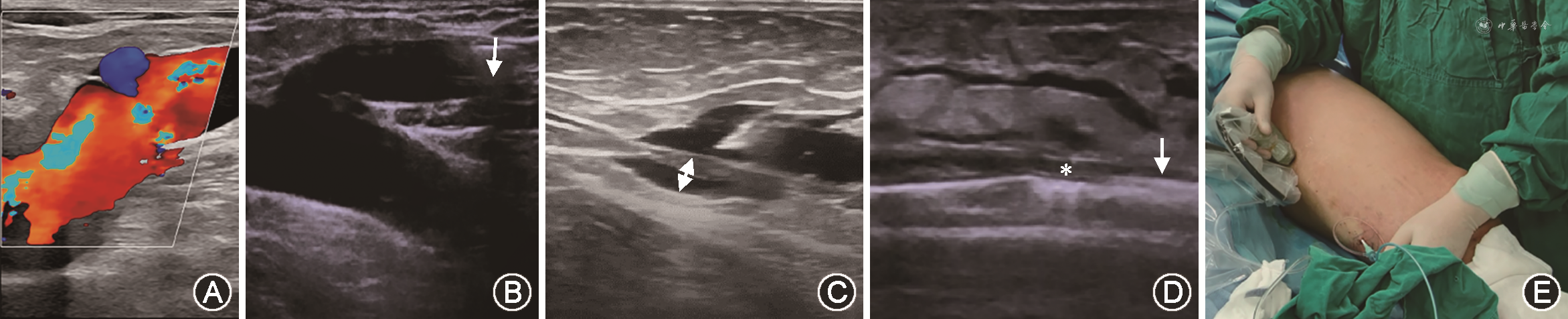 2. GSV主干微波消融闭合手术(图1):患者术区消毒铺巾,利用超声检查GSV全程后用穿刺针于超声引导下在患侧肢体大腿下段内侧GSV主干处穿刺,穿刺成功后置入7 F血管鞘。由7 F鞘内插入一次性水冷微波消融针(MTC-137),并向近心端上行至距离隐股静脉结合部2 cm处,超声引导下分段围绕GSV注射肿胀液,使周围液性暗区达到10 mm以上同时压闭GSV。再次确认微波消融针距隐股瓣膜开口约2 cm后开始微波消融闭合。打开微波治疗机,设定功率50 W,10 mm作为一个治疗点,脚控微波脉冲,缓缓后撤微波消融针,每点治疗时间3~4 s。消融针头部退至GSV穿刺点附近,则停止治疗,退出消融针。如若发现消融段GSV有流动血流则中转为GSV高位结扎、主干硬化剂注射术闭合GSV主干或激光消融闭合。