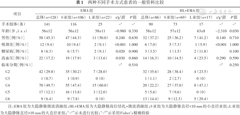 1.对象:本研究获中山大学附属第一医院临床科研和实验动物伦理委员会审批[批准文号:(2021)112]。回顾性分析本院血管外科中心2017年1月至2019年11月期间收治的214例原发性下肢静脉曲张患者的资料。依据手术方式分为两组:大隐静脉微波消融组(EMA组,n=128)和大隐静脉高位结扎+微波消融组(HL+EMA组,n=86);进一步根据GSV主干直径进行亚组分组:<10 mm的小直径亚组(S亚组)和≥10 mm的大直径亚组(L亚组)。