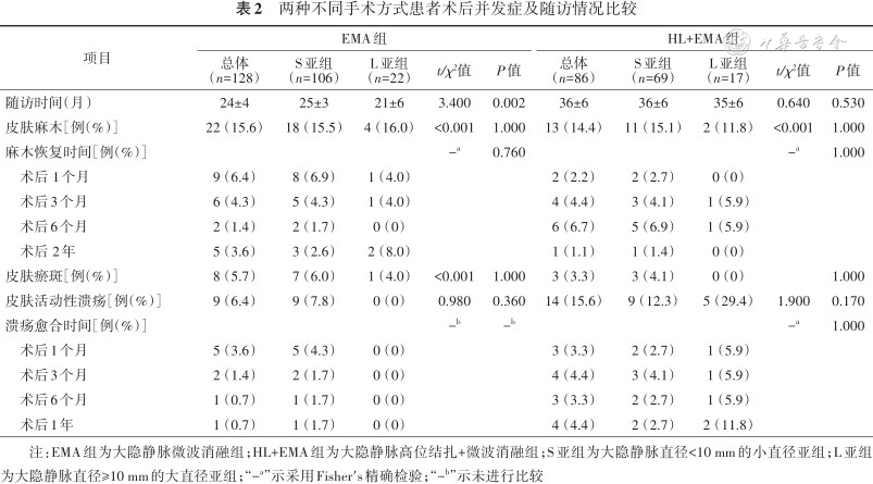 注:EMA组为大隐静脉微波消融组;HL+EMA组为大隐静脉高位结扎+微波消融组;S亚组为大隐静脉直径<10 mm的小直径亚组;L亚组为大隐静脉直径≥10 mm的大直径亚组;“-a”示未进行比较;“-b”示采用Fisher′s精确检验