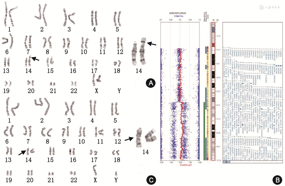 孕妇,27岁,孕2产1,孕16周时于外院行血清学筛查,提示21-三体风险为1∶860,处于高危和低危之间的灰区,于孕19周时行无创DNA(NIPT)检测,提示14号染色体三体高风险,遂于2019年4月22日孕21周时在我院行羊水穿刺,进行染色体核型及基因芯片—单核苷酸多态微阵列(SNP-array)检测。孕妇羊水穿刺术后第2天破水,第3天引产,分娩一女婴,胎儿外观正常。孕20周时B超仅提示胎儿发育较正常孕周小1周,其他情况不详。因胎儿染色体核型结果异常,进而对夫妻双方行染色体核型分析。此夫妇已育有一子,3岁,身体及智力发育均正常,夫妻拒绝给其子做外周血染色体检测。