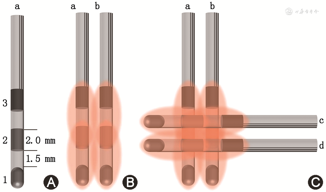 患者在清醒状态下行立体交叉RF-TC毁损治疗。将毁损靶点对应电极外接R200BM1射频发生系统(北京北琪公司),毁损分2步进行:(1)同根电极相邻2个触点之间进行双极毁损,先行1次2 W、40 s预毁损,监测患者毁损中是否出现语言、运动等功能障碍,再连续进行2次3 W、60 s正式毁损;(2)同根电极相邻触点毁损结束后,行平行电极相邻触点的二维毁损,最后选择不同电极之间相邻距离<7 mm的电极触点进行2次3 W、60 s的立体交叉毁损(图1)。毁损结束后继续记录5~10 min颅内脑电波,监测患者一般状况及颅内放电情况。确定治疗效果满意后拆除导向螺钉、拔除电极。术后观察2~3 d无明显异常即可出院[7, 8]。
