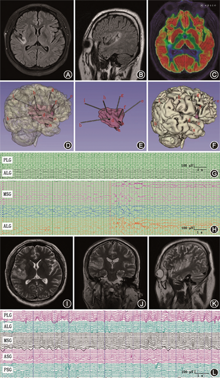 以2号患者为例,男性,31岁,发作表现为左侧肢体的麻木、活动障碍及吞咽动作,发作期间伴有左耳耳鸣。MRI可见右侧岛叶皮质脑回样异常信号,FLAIR上为高信号,PET-CT显示右侧岛叶部分代谢减低。行SEEG电极植入,斜行覆盖右侧岛叶前后部,垂直覆盖额叶岛盖,角回至岛叶,颞横回、中央区至岛叶等。发作早期脑电图显示第二岛长回内的电极触点提前1~3 s出现低幅快节律放电,并扩散至第一岛长回。颅内电刺激2 mA即可诱发惯常发作,考虑第一、二岛长回为致痫区域,对其进行重点毁损,对岛长回内垂直距离<7 mm的电极触点进行交叉毁损。术后复查MRI提示毁损后组织学改变与术前计划一致,患者至今保持癫痫完全缓解(图2)。