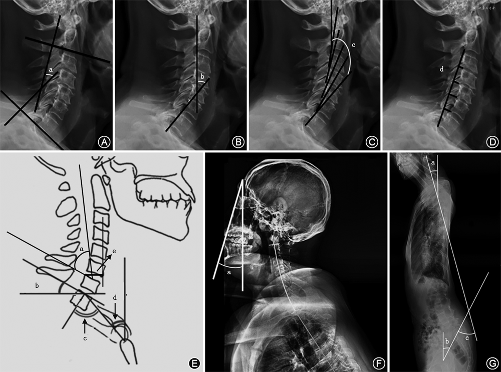 1.CL的测量:测量CL的4种最常见方法包括改良的Cobb方法(mCM)、Jackson生理应力线(JPS)、Harrison后切线(HPT)方法和Ishihara指数[6](图1A~D)。通过C2法的mCM来获得CL,沿C2和C7下终板绘制两条水平线,分别绘制与前两条线垂直的附加线,两条垂直线所成的角度即C2-7 CL;C1法是从C1的前结节延伸到C1棘突的后缘代替C2的终板作为上参考线来测量C1-7颈椎矢状位Cobb角;用JPS法测量CL时沿C2和C7椎体后壁各画一条直线,这两条直线交角的数值就是CL的测量值。HPT法是从C2到C7所有的颈椎椎体后表面画出平行的直线,然后将所有的节段角度相加得到一个整体的CL角度[7]。Ishihara指数,又称颈椎曲度指数,连接C2的椎体下后端到C7的椎体下后端,从C3、C4、C5、C6椎体下后端分别做垂线,Ishihara指数为4条垂线段的长度和除以C2下后端到C7下后端连线的长度。美国的Janusz等[8]通过对44例患者mCM、JPT和HPT方法的CL测量,认为三种方法均可靠有效,且不同测量者的测量值无明显差异。