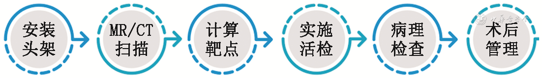 立体定向颅内病变活检术可分为有框架与无框架立体定向技术。有框架立体定向脑活检技术,首先将立体定向框架固定于患者的颅骨上,通过影像学扫描(MRI/CT),将颅内病变的空间坐标(X、Y、Z)与定向仪框架之间坐标关系确立。运用计算机治疗计划系统软件或采用MRI/CT扫描的影像片,进行人工绘图计算法,可获得患者颅内病变活检靶点X、Y、Z数值,通过此X、Y、Z数值,就可以在患者头颅定向仪框架X、Y、Z轴上,寻找出具体位置(即颅内病变信息转换到定立体定向仪框架上)。此时手术者再把定向仪配套的导向装置,如定位侧环、导向仪弧形弓、载持器等,按照上述给予X、Y、Z坐标位置,分别顺序、牢靠地正确固定在相对应的定向仪框架上,然后将活检针(钳)置入弧形弓载持器上并固定,核实各坐标值、进针轨迹、靶点均正确,一切就绪,把活检钳或活检针缓慢、轻柔、准确地送到手术靶点区,切取临床所需病理组织块,立刻送往病理科进行病理检查,得到满意肯定答复,手术结束。