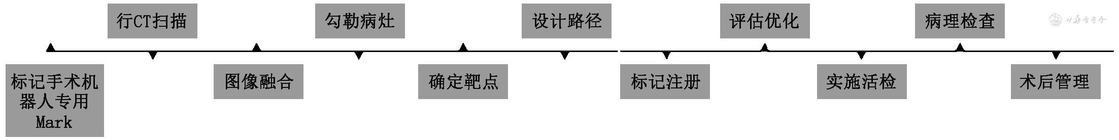 1.无框架立体定向颅内病变活检,包括神经外科导航系统和神经外科机器人两种,二者手术步骤基本相同。主要差别在于:(1)应用神经外科机器人辅助活检,患者头部可选择金属Marker为标记,在头颅骨不同位置上置入5~8枚Marker,使手术精度更高。亦可采用具有标记作用的粘贴Marker,直接贴于头皮上不同位置5~8处;或利用头、面部特征点,用无接触式的激光扫描,进行注册与匹配;(2)神经外科机器人机械臂辅助引导钻孔位置,并可计算深度。手术和取材操作方法同有框架活检。