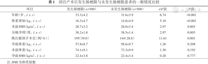 500例剖宫产术后肠梗阻患者的年龄为(33.3±4.2)岁;500例剖宫产术后未发生肠梗阻患者的年龄为(31.6±3.9)岁。肠梗阻患者术前体重为(74.1±9.1)kg,孕期体重增加(16.3±4.8)kg,均高于非肠梗阻患者,分别为(73.3±9.9)和(14.8±4.9)kg,差异均有统计学意义;肠梗阻患者分娩孕周为(38.2±1.8)周,小于非肠梗阻患者的(38.5±1.4)周,差异有统计学意义。肠梗阻患者中有既往腹部手术史的有39.0%(195例),多于非肠梗阻患者的28.8%(144例),差异有统计学意义(P=0.001)。见表1。