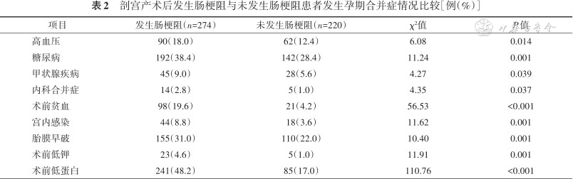 肠梗阻患者和非肠梗阻患者中分别有274例(54.8%)和220例(44.0%)患者发生孕期合并症。孕期合并症为高血压疾病、糖尿病、甲状腺疾病、内科合并症、术前贫血、宫内感染、胎膜早破、术前低钾、术前低蛋白,肠梗阻患者孕期合并症的发生率均高于非肠梗阻患者,差异均有统计学意义(均P<0.05)。见表2。