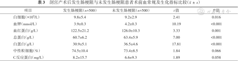 | 项目 | 发生肠梗阻(n=500) | 未发生肠梗阻(n=500) | t值 | P值 |