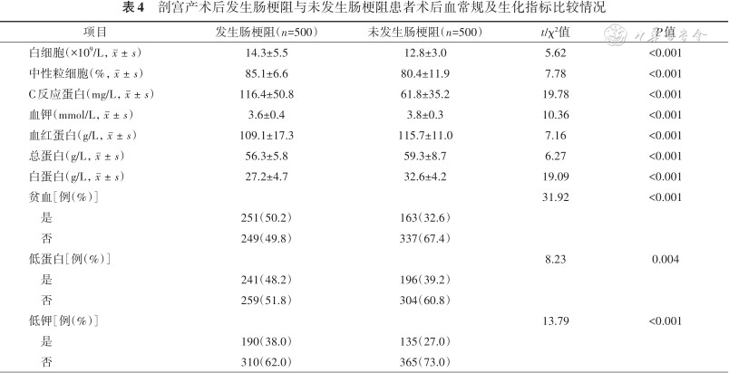 以2009年4月至2019年4月在首都医科大学附属北京妇产医院住院行剖宫产术分娩并发术后肠梗阻的500例患者为病例组,以与病例组同一日行剖宫产术的术后未发生肠梗阻的500例患者为对照组。收集患者一般情况、孕期合并症、血常规及生化指标、与手术相关因素等资料,比较肠梗阻患者和非肠梗阻患者间差异。采用多因素logistic回归模型分析剖宫产术后肠梗阻的相关影响因素。