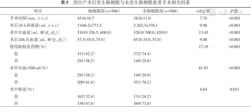 | 项目 | 发生肠梗阻(n=500) | 未发生肠梗阻(n=500) | t/Z值 | P值 |