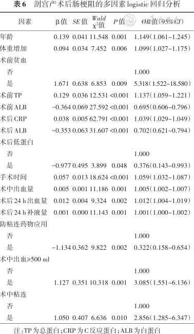 术前贫血[OR值(95%CI)为5.318(1.522~18.580)]、术后低蛋白[OR值(95%CI)为0.376(0.143~0.993)]、术中出血≥500 ml[OR值(95%CI)为3.085(1.551~6.136)]、术中粘连[OR值(95%CI)为2.856(1.285~6.347)]是剖宫产术后发生肠梗阻的相关危险因素;术中应用防粘连药物[OR值(95%CI)为0.322(0.158~0.654)]是剖宫产术后发生肠梗阻的相关保护因素,均P<0.05。见表6。