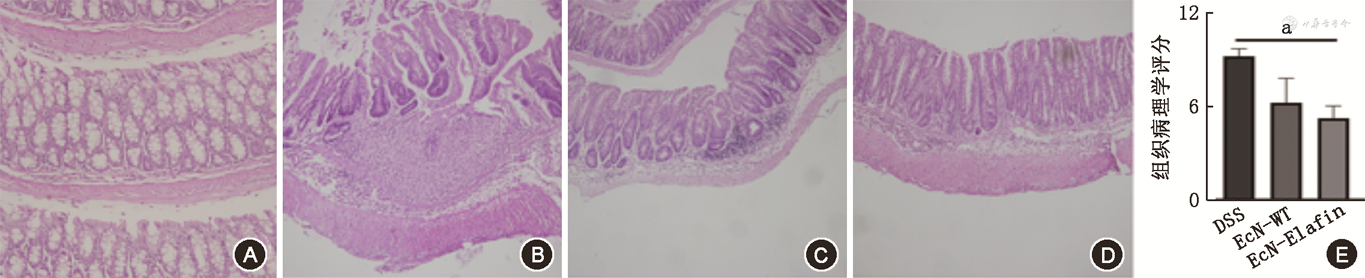 注:PBS为健康对照组,n=6;DSS为结肠炎组,n=8;EcN-WT为野生型EcN治疗结肠炎组,n=8;EcN-Elafin为EcN-Elafin治疗结肠炎组,n=8;aP<0.05;A~D为苏木精-伊红(HE)染色(×200);DSS为葡聚糖硫酸钠