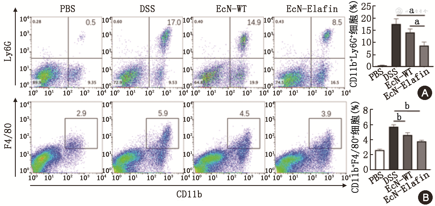 4.EcN-Elafin对DSS诱导小鼠急性结肠炎模型结肠固有层浸润中性粒细胞和巨噬细胞比例的影响。分离各组小鼠结肠固有层细胞进行流式分析结果显示:EcN-Elafin组小鼠结肠固有层浸润中性粒细胞比例低于DSS组[(8.65±1.49)% 比(17.60±2.16)%,q = 10.29,P<0.01],同时也低于EcN-WT组[(14.1±1.47)%,q=6.26,P<0.01]。然而EcN-WT组小鼠结肠中浸润的中性粒细胞比例与DSS组相比差异无统计学意义(P>0.05)。对各组小鼠结肠固有层巨噬细胞比例进行分析发现,EcN-Elafin组低于DSS组[(3.79±0.26)% 比(5.73±0.45)%,q=8.80,P<0.01]。EcN-WT组也低于DSS组(P<0.05),然而与EcN-Elafin组相比,差异无统计学意义(P>0.05)(图4)。