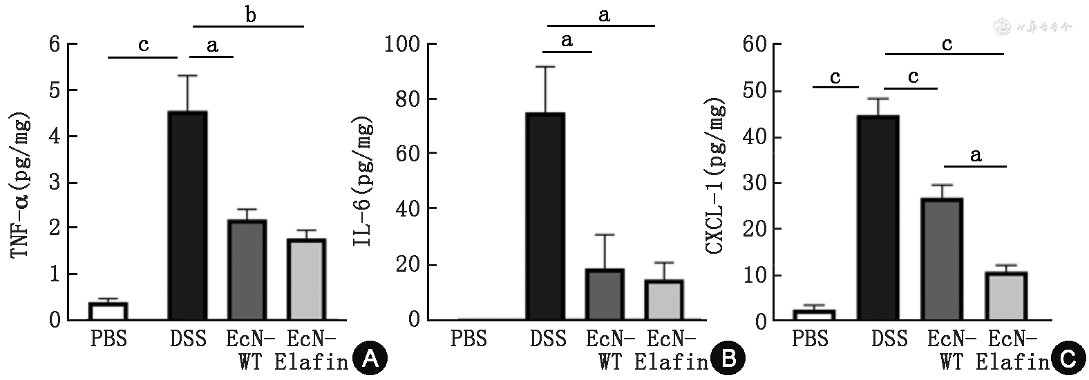 在EcN-Elafin的培养基上清和菌体沉淀中均能检测到Elafin蛋白。与DSS组相比,EcN-Elafin组和EcN-WT组小鼠体重减轻状况和DAI评分均明显改善。EcN-Elafin组小鼠结肠长度显著长于DSS组。EcN-Elafin组结肠炎组织学评分显著低于DSS组(5.3±2.3比9.3±1.4,P<0.05)。与DSS组小鼠相比,EcN-Elafin组小鼠结肠固有层浸润的中性粒细胞[(8.65±1.49)% 比(17.60±2.16)%,P<0.01]和巨噬细胞[(3.79±0.26)% 比(5.73±0.45)%,P<0.01]比例均显著降低。EcN-Elafin组和EcN-WT组结肠中TNF-α、IL-6、和CXCL-1蛋白质表达水平均显著低于DSS组。