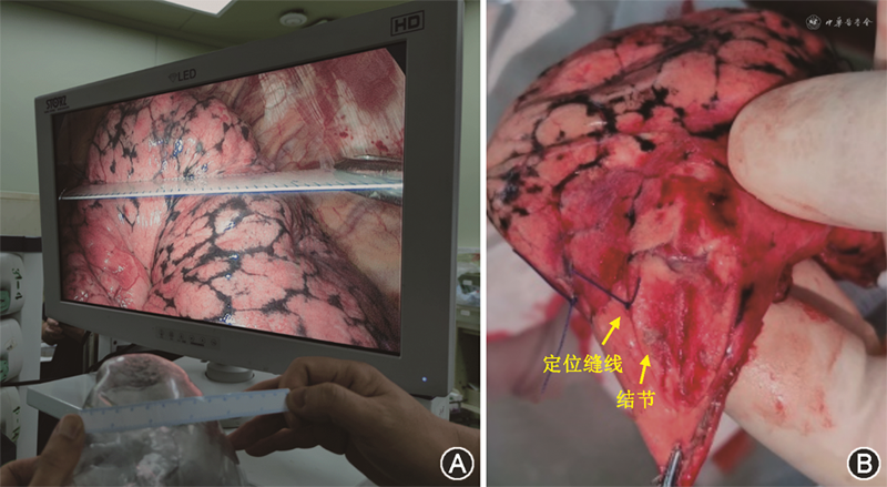 本方法为术中无创定位,无需对患者进行术前额外准备和操作。全身麻醉双腔气管插管行单肺通气,在打孔进入胸腔后,保持肺原位,肺处于半膨胀状态,开始定位。将仿真肺结节定位模型摆放于胸腔镜屏幕旁,由主刀医生实时对照模型上的结节位置,利用肺部各解剖标志点与肺结节之间的距离、比例等空间几何关系,“按图索骥”进行定位,并作缝线标记(图4)。解剖标志常参照肺裂、肺前后沿、肺尖肺底、大血管心脏压迹等。如因翻动肺叶造成空间关系变化,可重新鼓肺恢复初始关系,以便对照仿真模型。