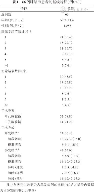 本研究共纳入66例患者,均行胸腔镜手术,其中单孔52例(78.8%),三孔14例(21.2%)。按照上述手术原则,24例单发结节患者中,肺段切除18例(75.0%),楔形切除6例(25.0%);46例多发结节患者中,肺段切除5例(11.9%)、楔形切除14例(33.3%),以及混合术式23例(54.8%)(其中肺叶切除+肺段切除2例、肺叶切除+楔形切除7例、肺段切除+楔形切除14例)。出血量为15.0 ml(5~60 ml)。总体并发症发生率为13.6%(9/66),其中术后持续漏气(>5 d)5例(7.6%)、乳糜胸1例(1.5%)、肺部感染3例(4.5%),无术后出血、支气管胸膜瘘、肺栓塞、心脑血管事件等并发症发生,无围手术期死亡(表1)。