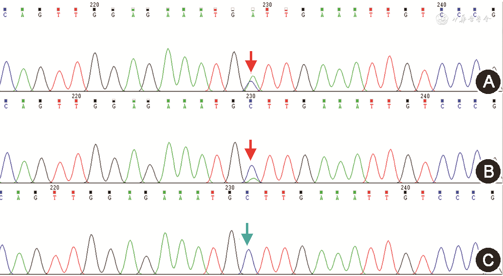 3. Sanger测序验证:经比对,先证者存在DMD基因c.4707C>A(p.C1569X)杂合突变,先证者母亲未携带该突变。进一步验证,先证者无表型父亲携带该位点突变(图2),经2次正反向引物测序,结果均证实为嵌合体,通过Mutation Surveyor的峰图面积计算突变比例约17.7%。
