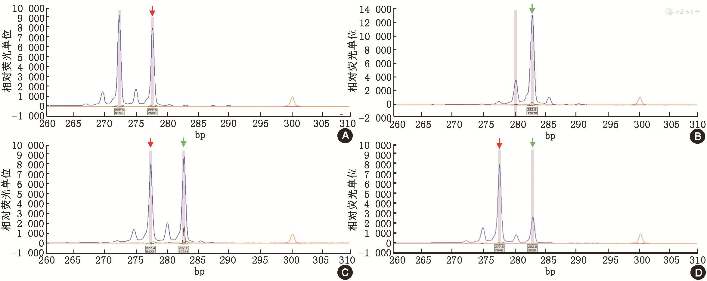 注:绿色箭头示父亲X染色体长度峰,红色箭头示母亲X染色体长度峰